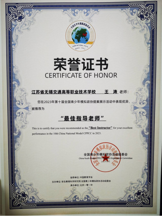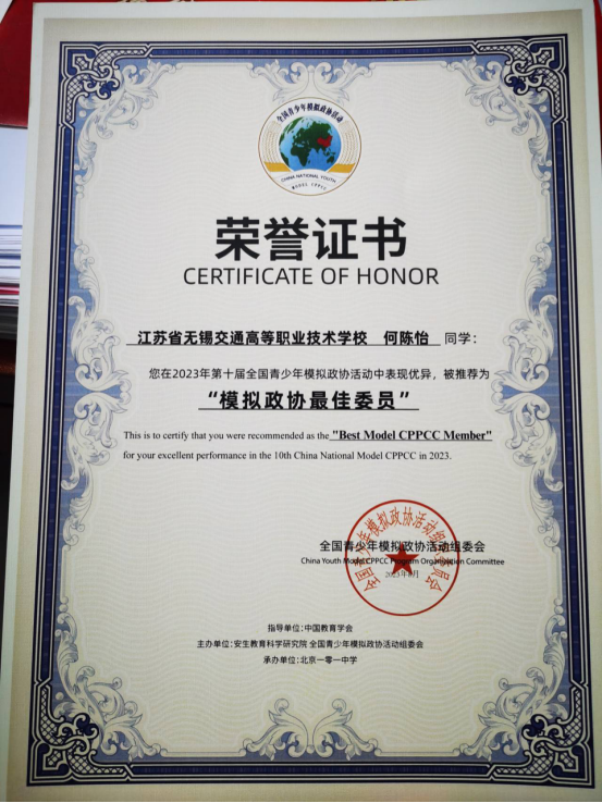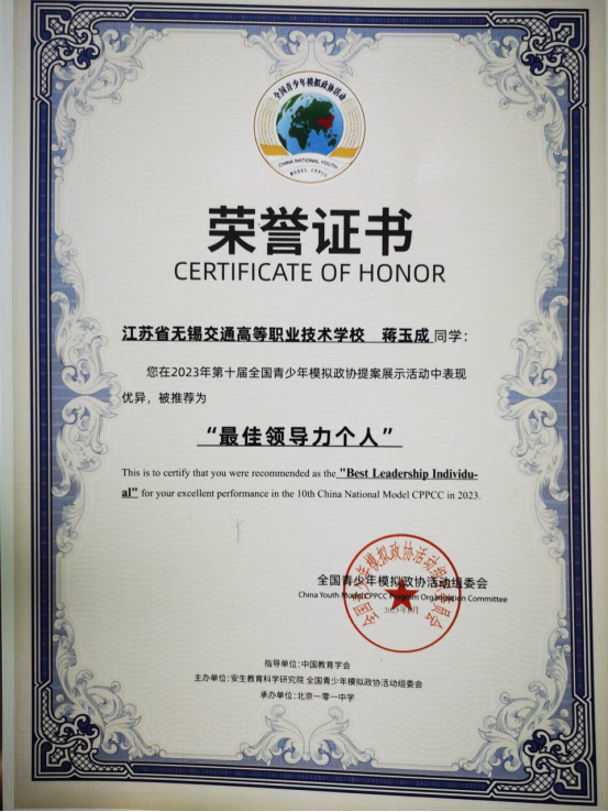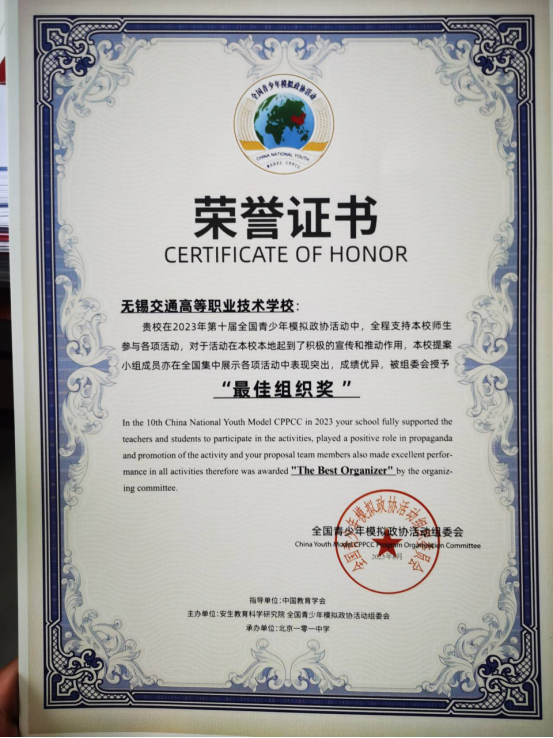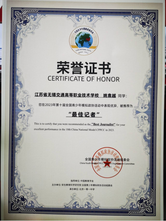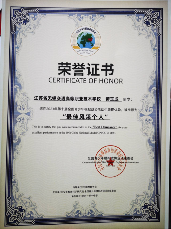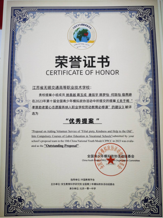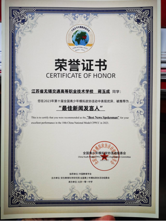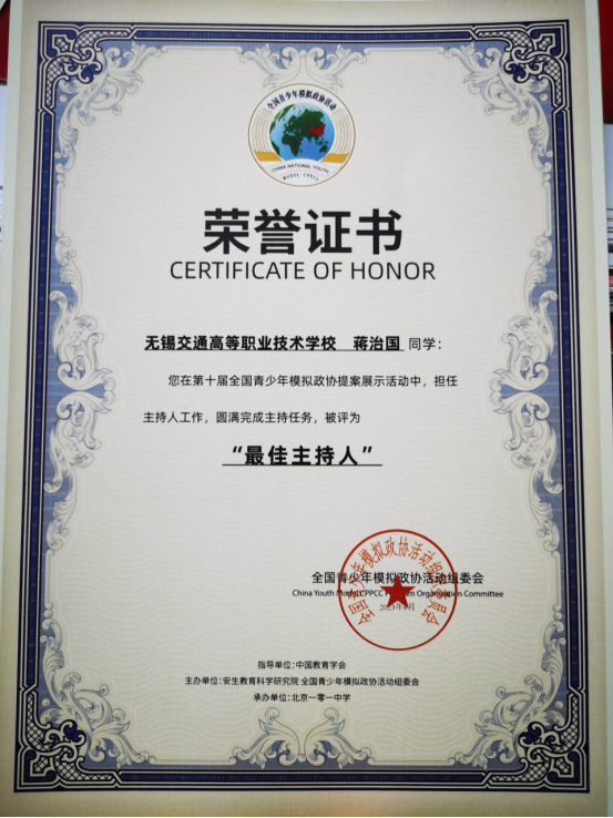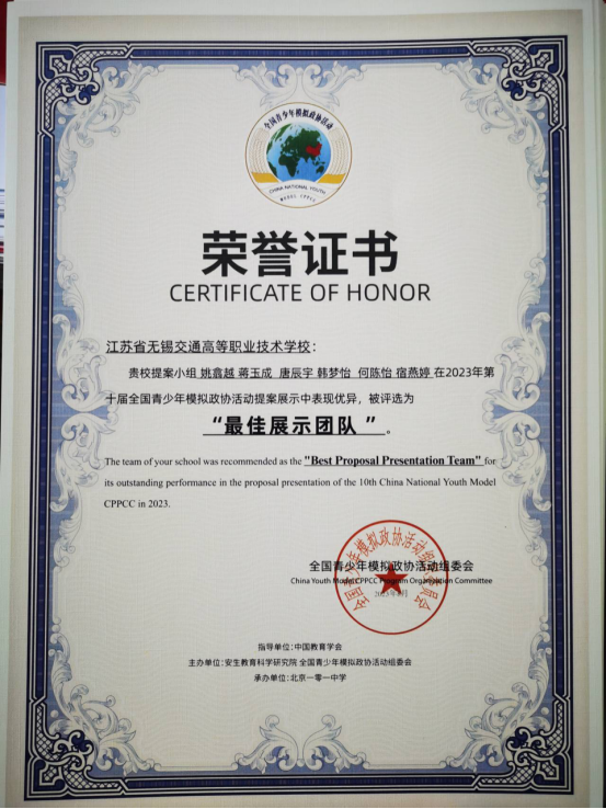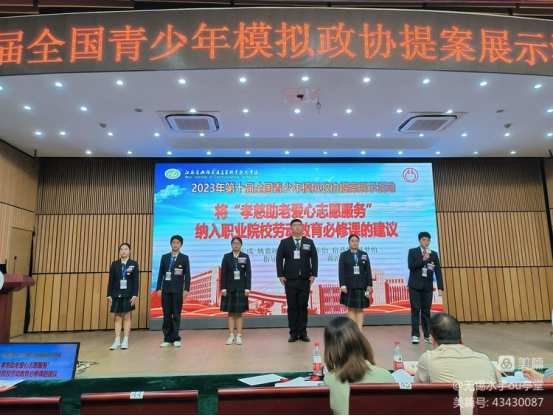 由蒋玉成、姚翕越、唐辰宇、韩梦怡、何陈怡、宿燕婷等青年学生组成的“模拟政协委员”小组,展示“将孝慈助老爱心志愿服务纳入职业学校劳动教育的必修课”的提案,通过对政协委员履职方式和政协会议组织形式的模拟,近距离体验人民政协制度。小组成员制作了视频和PPT,从医疗、教育、科协、记者、妇联、经济不同领域围绕提案进行阐述。学生们积极回答评委提问,将视野从“学校小课堂”转向“社会大课堂”,他们对所选话题的调研深度、覆盖广度以及建议的精细度,得到了现场嘉宾、评委和老师的好评。学校荣获最佳展示团队优秀提案奖和最佳组织奖三个奖项,蒋玉成荣获最佳领导力最佳新闻发言人最佳风采奖三个大奖,宿燕婷姚翕越何陈怡同学荣获模拟政协最佳委员姚翕越还荣获最佳记者奖,蒋治国两位老师荣获最佳指导老师蒋治国老师还荣获最佳主持人,个人合计获奖10人次