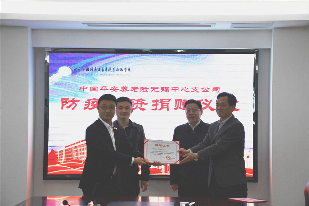 4月23日,学校举行防疫物资捐赠仪式。会上,中国平安养老险无锡中心支公司为学校捐赠10000只口罩,无锡市教育局高职处副处长蔡锦山、中国平安养老险无锡中心支公司党支部书记谢琨、宝威·体育党委书记李虎出席会议。
