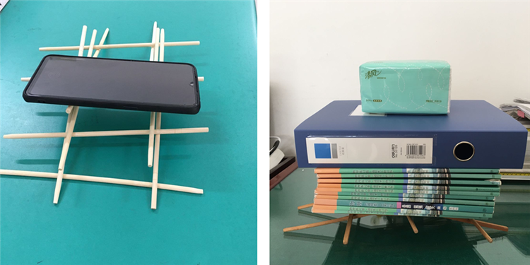 用筷子搭建桥梁,不仅是进行简单的搭建,更重要的是构思如何搭建足够结实的桥梁。活动结束后,师生分享活动心得,总结筷子间摩擦力的大小、筷子的形状、桌面的摩擦力大小等影响搭建质量的因素。