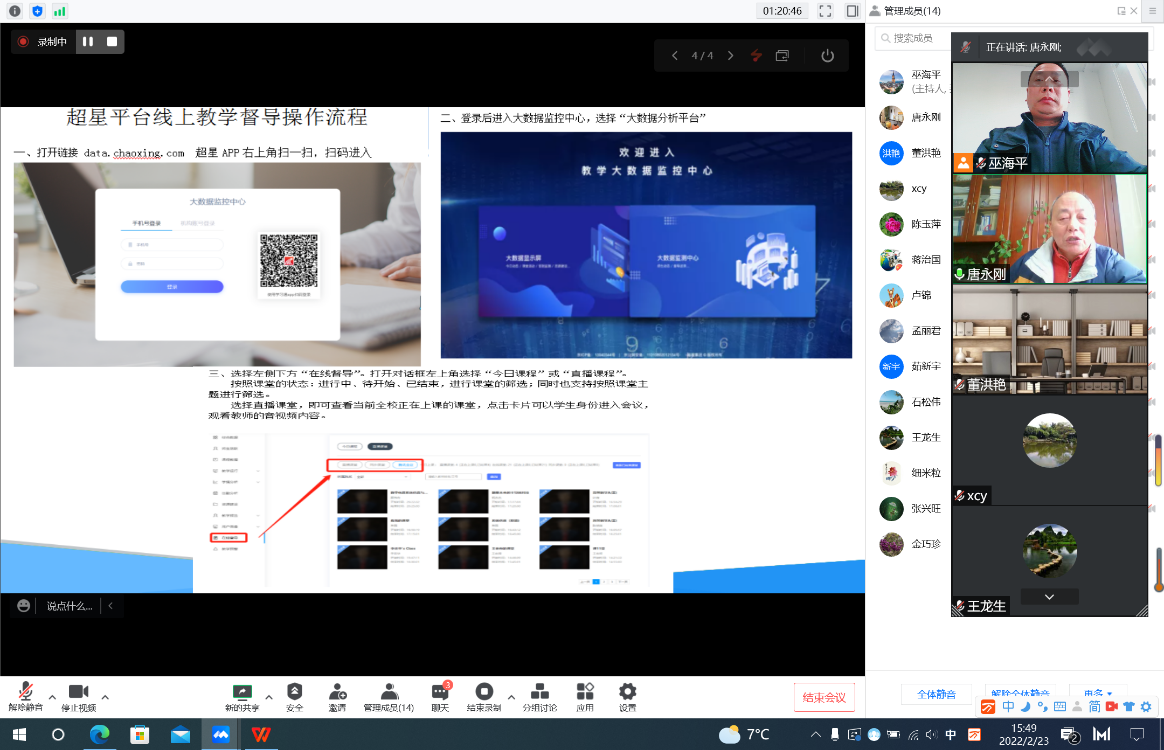 会上,唐处长首先对全体督导员上学期教学督导工作表示充分的肯定,并传达了学校《关于进一步规范线上教学工作的通知》。发展规划处巫海平老师也就后期如何有效开展线上教学督导等工作进行了安排。为了方便督导听课、巡课,在线演示了超星平台在线督导的操作方法。