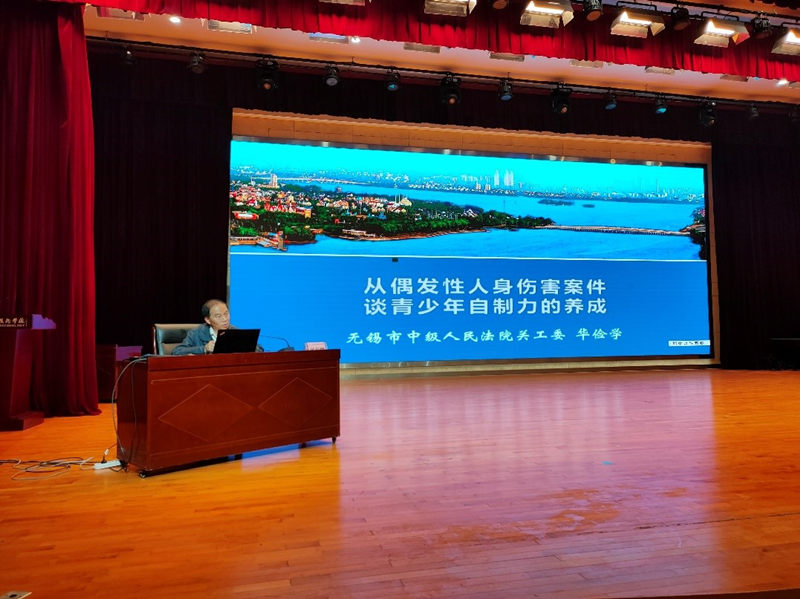 华俭学主任讲解了现实生活中人身伤害案件的起因,随后进行了故意伤害案例的分享,对案例进行解读,告诫同学们要加强自我防范意识,树立法治观念,在成长的道路上与法同行。最后,华俭学主任向学校捐赠了30本无锡中院编印的《民法用典30问》书籍。