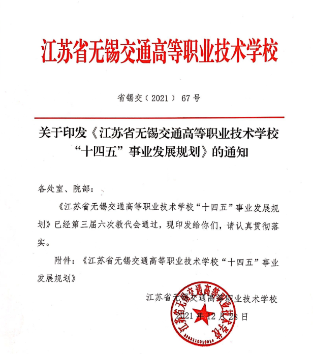 学校“十四五”规划立足新发展阶段,贯彻新发展理念,构建新发展格局。全校师生将在“十四五”规划引领下,凝心聚力、攻坚克难,狠抓落实、干事开拓,奋力开创学校改革发展新局面,为交通运输现代化示范区建设和区域经济社会发展提供更高水平的技术技能人才支撑,共同谱写学校各项事业辉煌发展的新篇章。