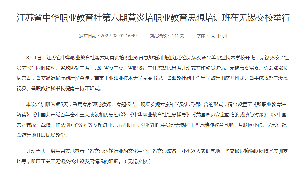 【江苏省交通运输厅官网】江苏省中华职业教育社第六期黄炎培职业教育思想培训班在无锡交校举行