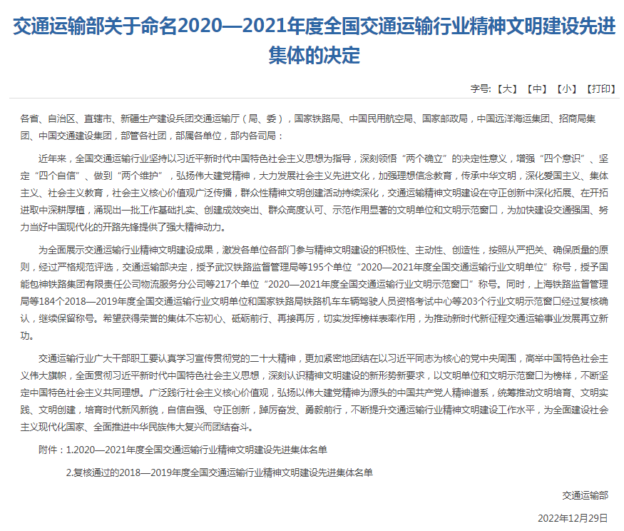 近日,交通运输部发布《交通运输部关于命名2020—2021年度全国交通运输行业精神文明建设先进集体的决定》(交政研发〔2022〕130号),公布了2020—2021年度全国交通运输行业精神文明建设先进集体名单,学校荣获“2020—2021年度全国交通运输行业文明单位”称号。