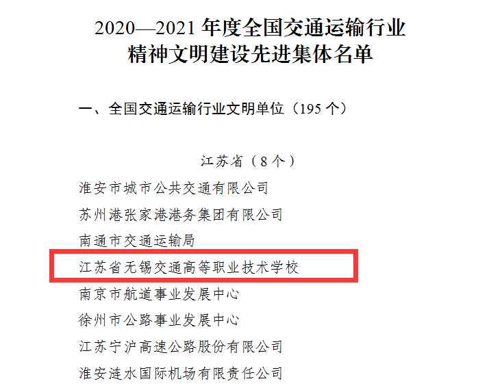 近年来,学校在江苏省交通运输厅党组坚强领导下,坚持以习近平新时代中国特色社会主义思想为指导,围绕中心、服务大局,凝心聚力,不断丰富文明创建内容,树立单位文明形象。学校先后创建成为江苏省职业教育德育特色学校,江苏省文明单位、江苏省智慧校园、江苏省和谐校园、江苏省平安校园、江苏省交通运输文化建设先进单位、全省交通运输文化建设示范单位。