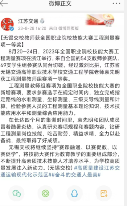 江苏交通:无锡交校教师获全国职业院校技能大赛工程测量赛项一等奖