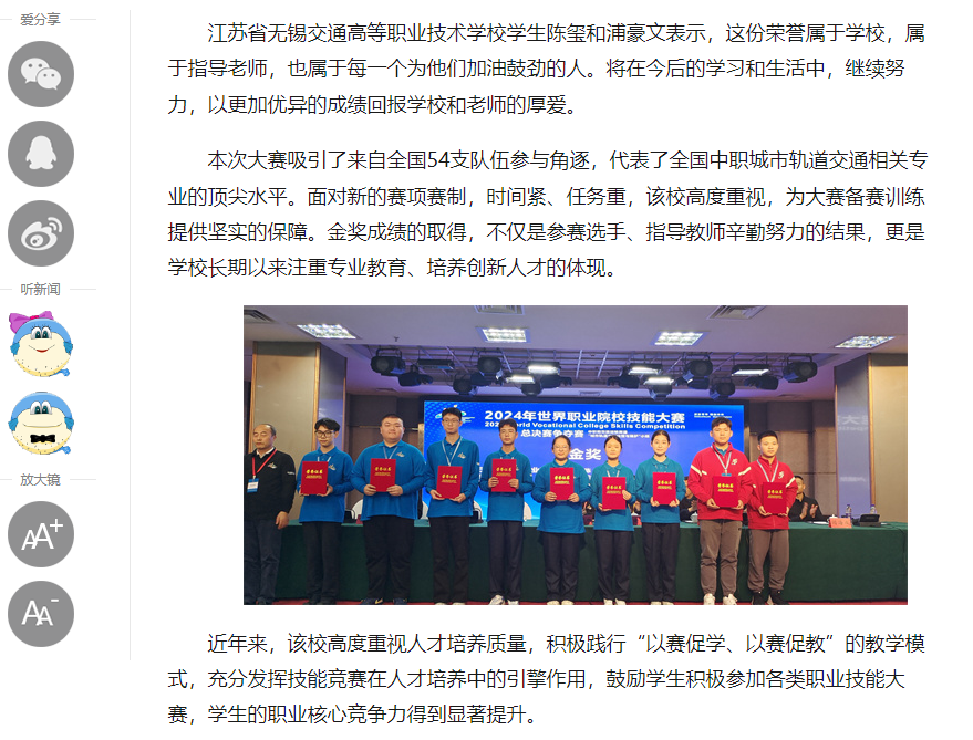 中江网:无锡学生团队荣获2024年世界职业院校技能大赛争夺赛城轨运营与维护赛项金奖