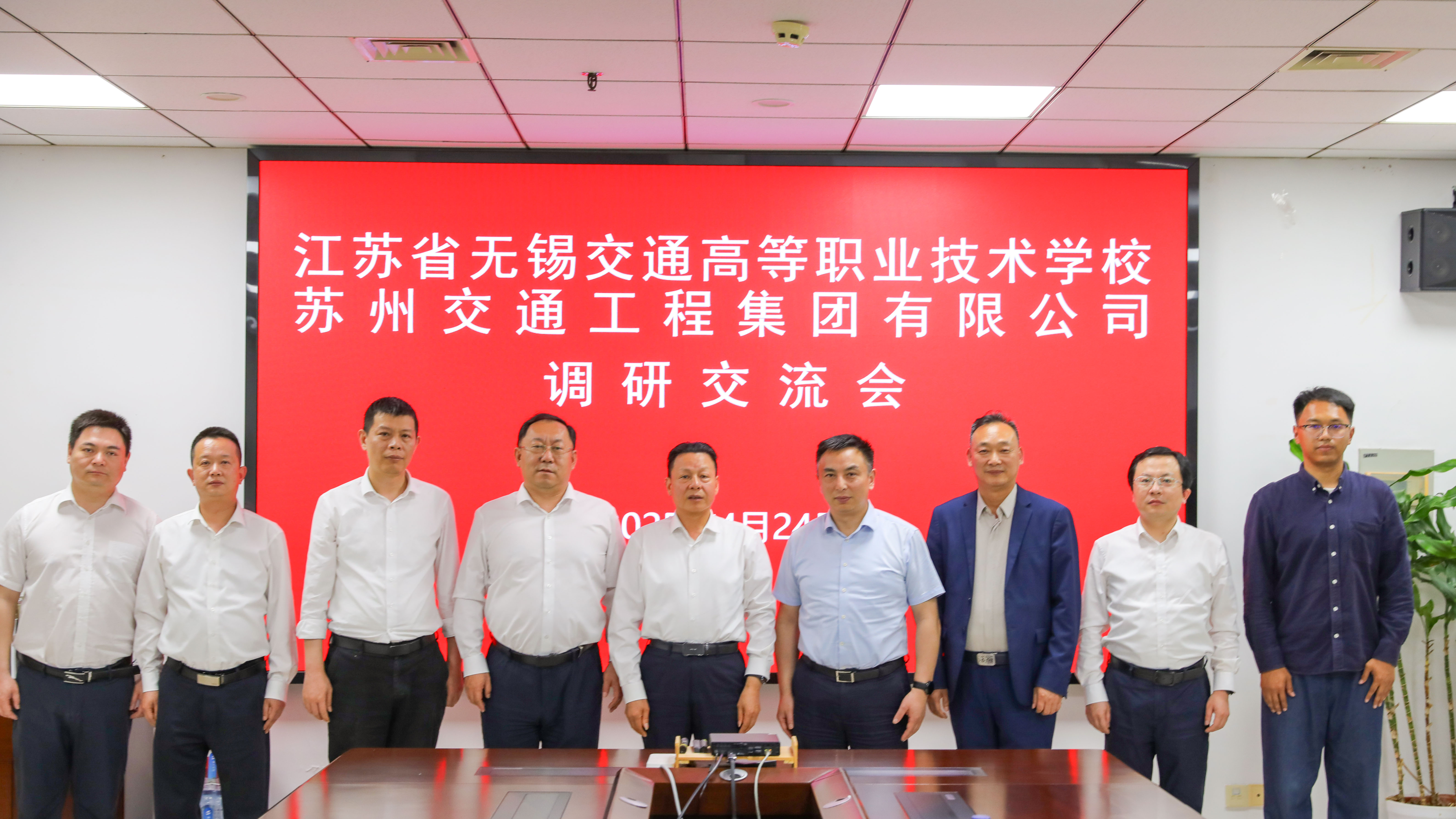 为贯彻落实江苏省交通运输厅《关于发布2025年江苏交通运输重点培育企业名单的通知》文件精神,进一步提升学校产教融合水平、更好服务交通运输产业发展,4月24日,学校党委书记、校长李进率队赴苏州交通工程集团有限公司进行调研交流。