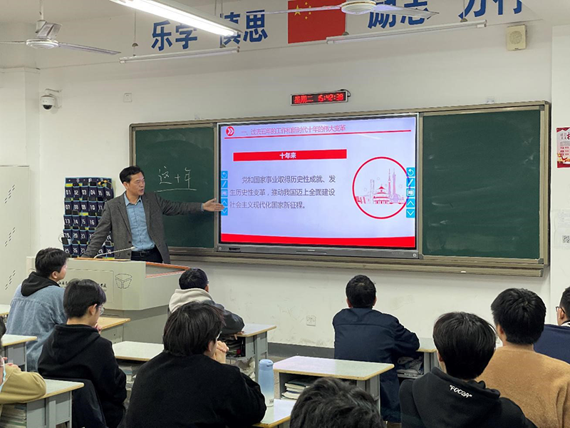 耿校长以“深入学习宣传贯彻党的二十大精神”为主题,向学生宣传讲解党的二十大报告精神。耿校长从大会的主题开篇,引导学生理解此次大会的重要意义。通过对新时代十年的伟大变革的详细讲解, 212311班的同学们作为新一代的青年,作为其中的一些事件的亲历者,都感同身受,与耿校长的讲解内容产生了共鸣。