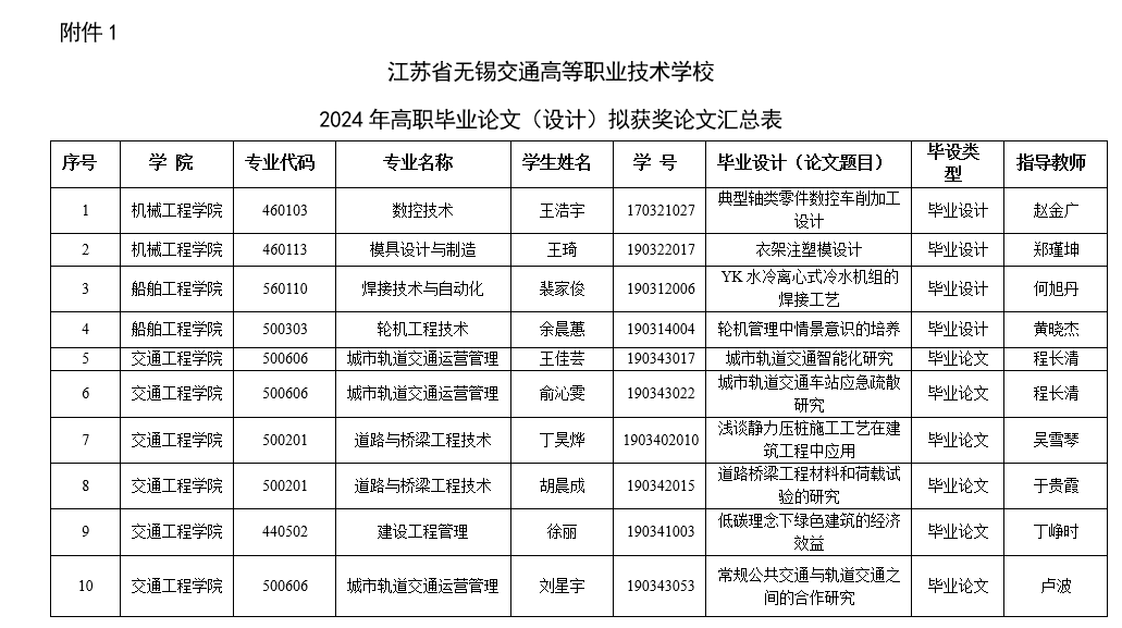 根据《关于做好2024届毕业生毕业论文(设计)答辩及优秀毕业论文(设计)认定的通知》,经各学院遴选推荐、组织专家评审,拟认定35篇作品为2024年学校五年制高职优秀毕业论文(设计),拟获奖名单详见附件1,现予以公示。公示期限:2024年7月5日—2024年7月11日。如有异议,请与教务处卢波老师联系,联系电话:0510-68781133。