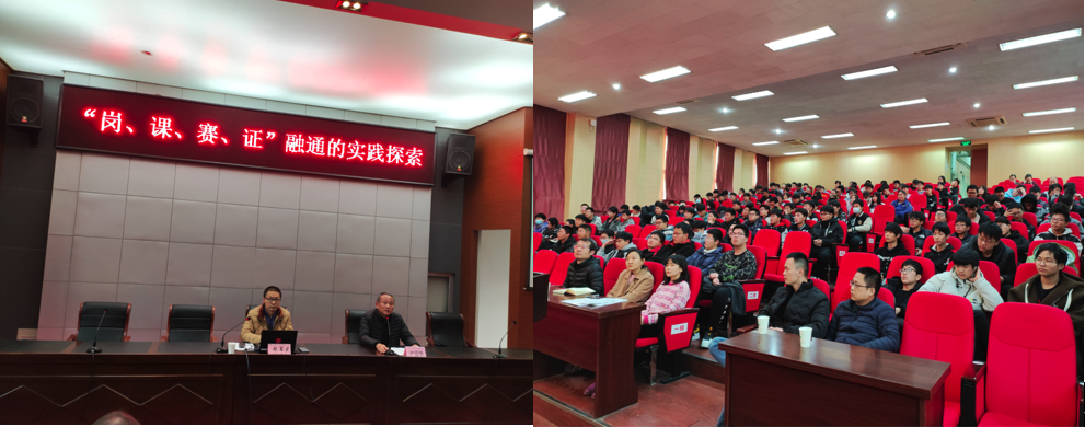 12月8日下午,学校邀请汽车工程学院郑军武院长、副教授,在校学术报告厅为全校师生做《“岗、课、赛、证 ”融通的实践探索》专题讲座,近180名师生到场聆听。讲座由科技与合作处处长尹爱华主持。