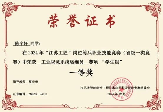 12月7日,“江苏工匠”岗位练兵职业技能竞赛——2024年江苏省智能制造工程技术应用职业技能竞赛工业视觉系统运维员赛项在常州圆满落幕。在本次大赛中,学校机电工程学院蔡昱灿老师获职工组一等奖,陈宇轩同学获学生组一等奖。