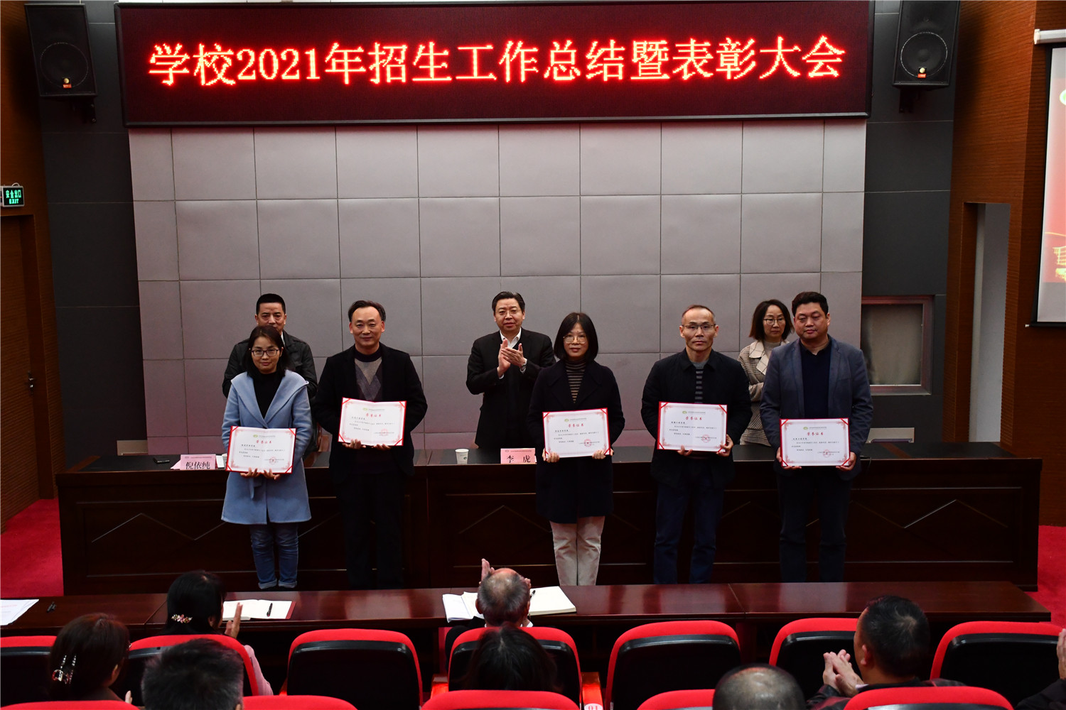 校领导对获奖集体和个人进行颁奖表彰。招生工作先进个人及先进集体代表发言,分享招生工作的经验和做法。