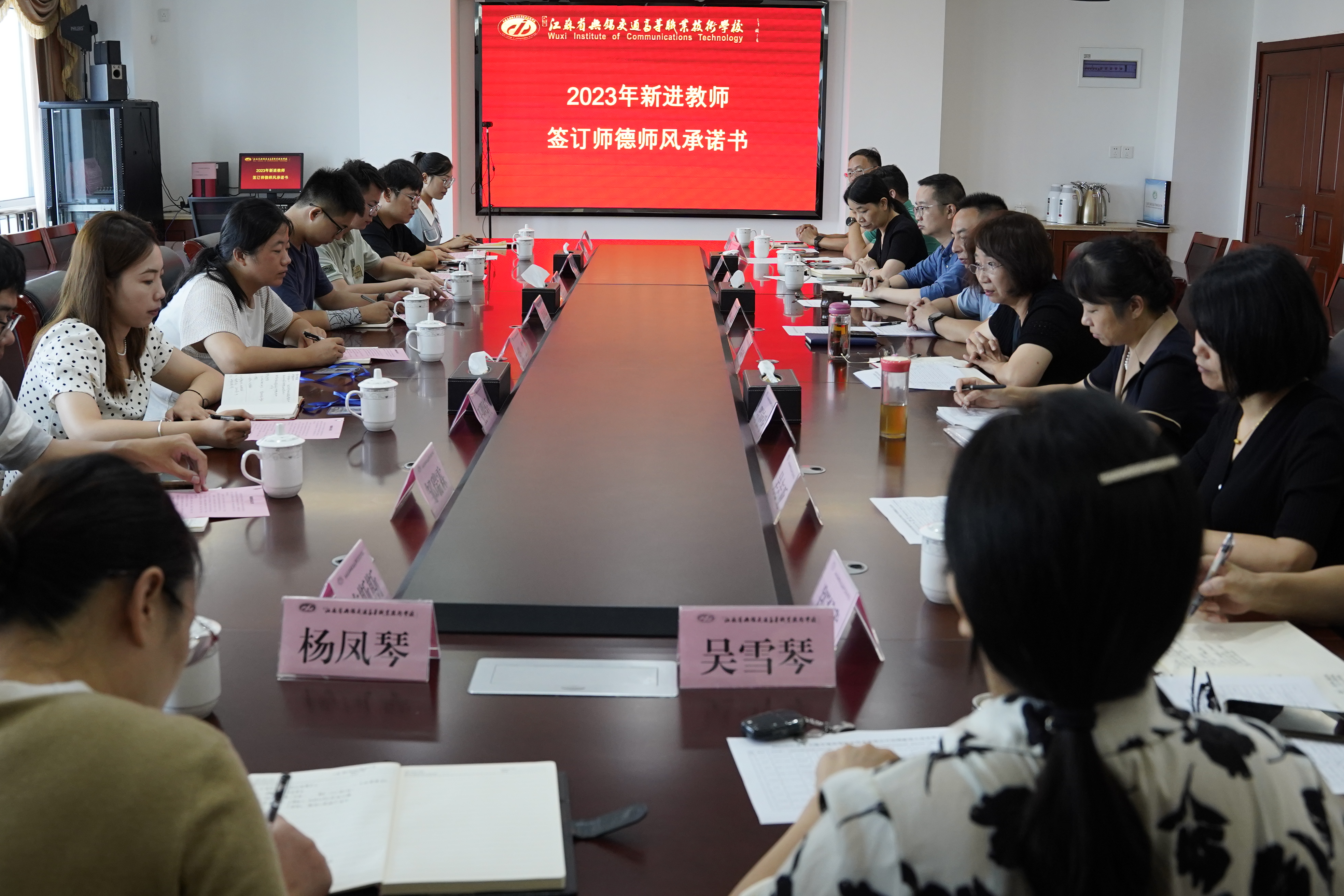 最后,新教师们签订《师德师风承诺书》,郑重承诺在教育工作中将严格遵守《高等学校教师职业道德规范》,自觉践行《新时代高校教师职业行为十项准则》,做到诚实守信、依法从教、模范遵守社会公德,争做“有理想信念、有道德情操、有扎实学识、有仁爱之心”的好老师。